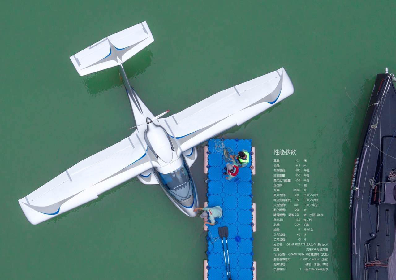 轻型运动飞机可直接在水上、陆地、草地、雪地、沙漠起降,拆卸式可折叠机翼,配备移动拖车可移动和停放在家里。
